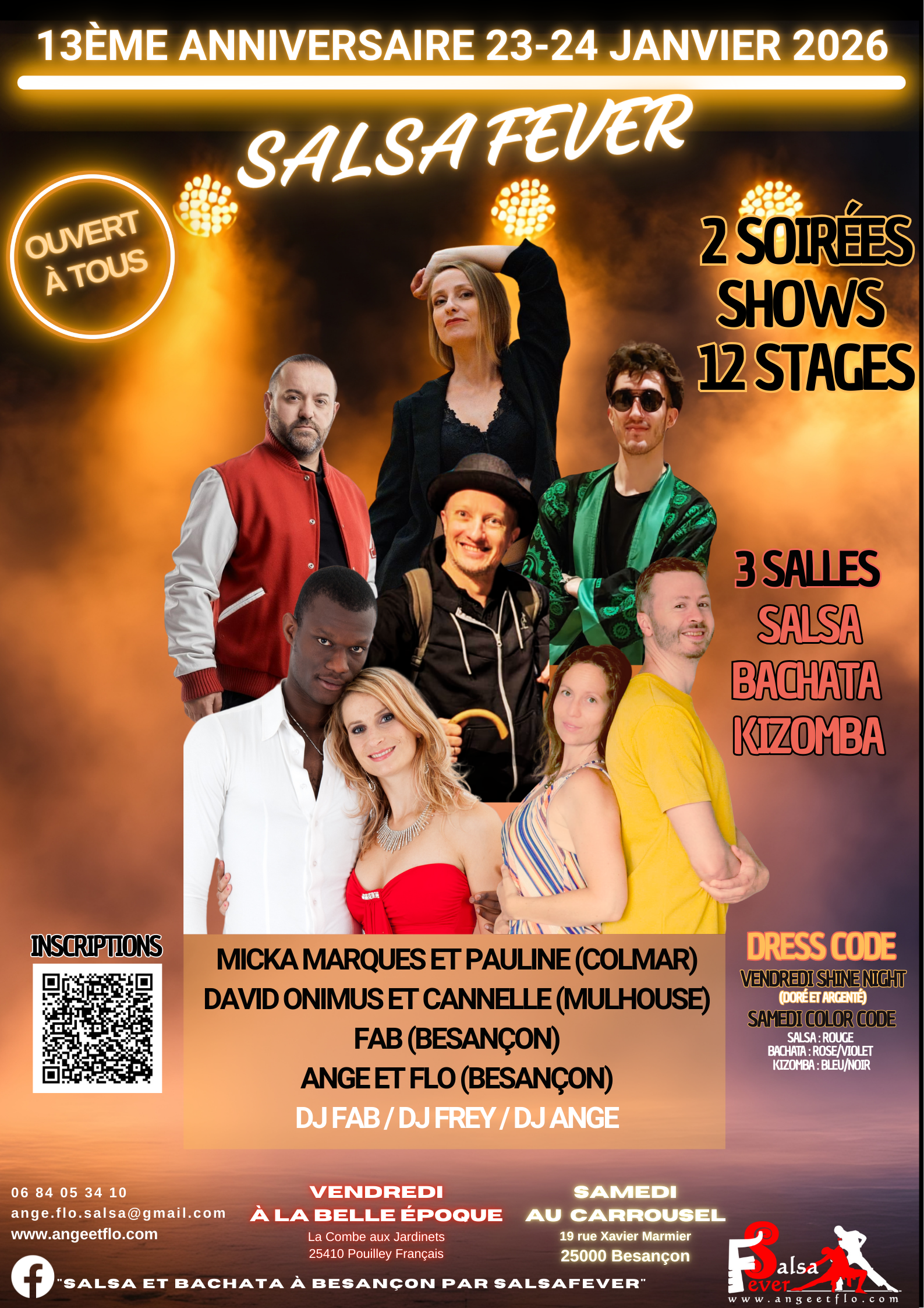 Venez fêter le 13ème anniversaire de Salsafever / Ange et Flo à Besançon avec 12 stages, 2 soirées 3 salles, des surprises, des cadeaux, des animations, des profs d’exception ! C’est ouvert à tous, venez seul, entre amis, en couple, en famille pour fêter les 13 ans de salsafever à Besançon !